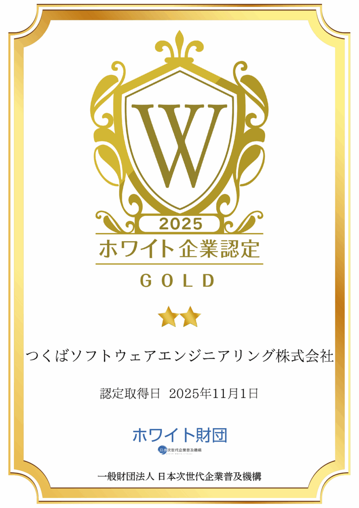 私たちつくばソフトウェアエンジニアリング株式会社は、2025年11月1日、一般財団法人日本次世代企業普及機構が実施する「ホワイト企業認定」において、最高ランクに次ぐ「ゴールドランク」を取得しました。前年度の「シルバーランク」から着実にステップアップを果たし、120点満点中92点という高評価をいただいています。